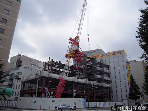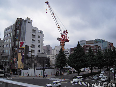 建設用のクレーンが姿を表しました。利休は3軒隣の仙台薬局新ビル5階に移転しました。